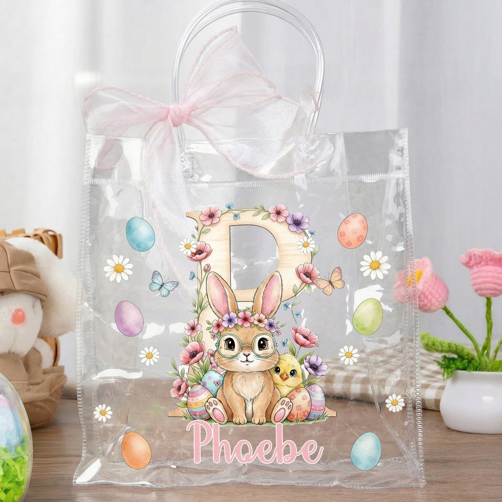 Denna transparenta presentpåse har ett charmigt rosa rosettband och lekfulla påskmotiv, inklusive söta kaniner, kycklingar och färgglada ägg. Du kan personalisera påsen med ett namn eller initialer, vilket gör den till en särskild och festlig påse, skräddarsydd för ditt barn.